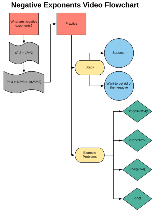 I used a flowchart to align my thoughts before making the video. Starting with a flowchart made it so that I wasn’t lost in the technology when trying to come up with the content of my video. This made it so I could think through what I wanted the video to accomplish but also to make sure that the video would flow. I was able to come up with good examples that showed a variety of different scenarios when dealing with negative exponents. This allowed, when the time came, to quickly make the slides in the Activinspire flipchart and then when I was actually filming I knew exactly where I needed to guide my words and thoughts instead of having to restart and edited different takes.